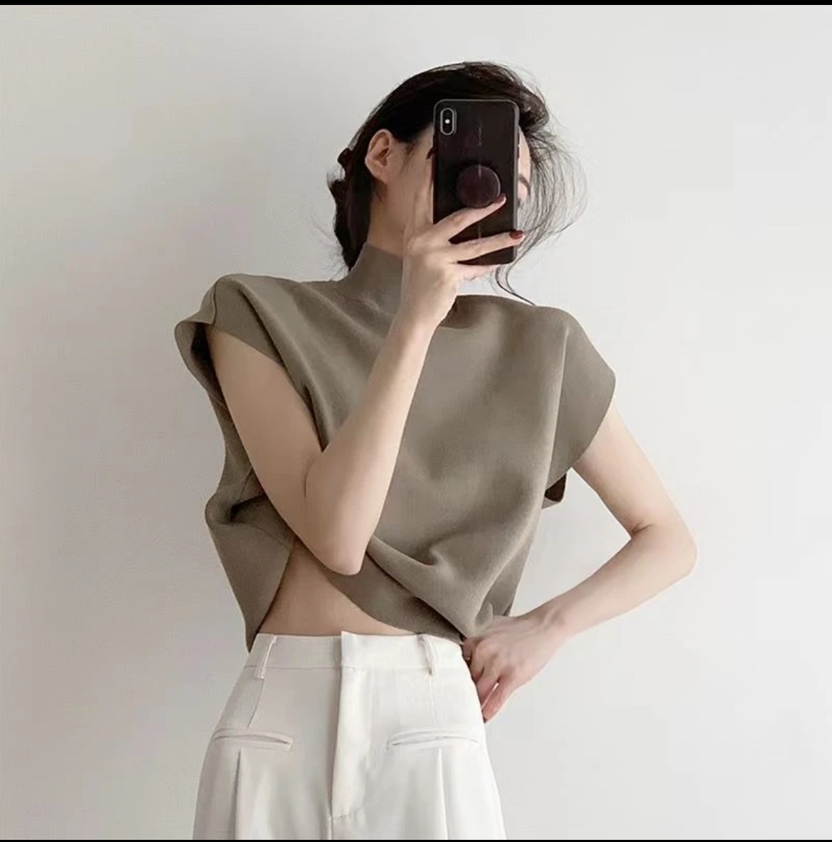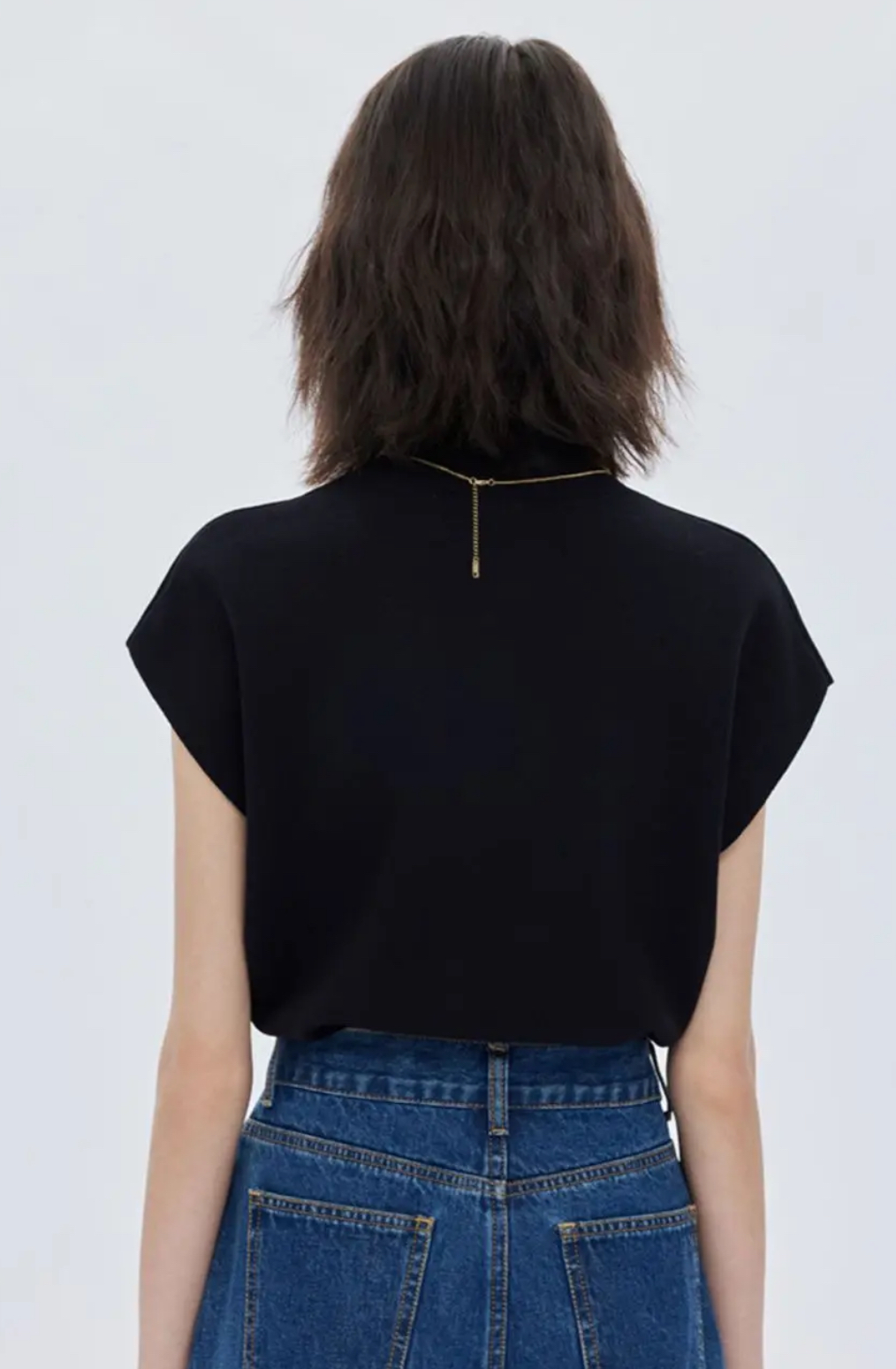 シンプルデザインのTシャツを着たモデル